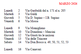 Lunedì 9 Via Flamini dal n. 17 al n. 29 Martedì 10 Via Flamini (numeri pari) Giovedì 12 Via Rosini Venerdì 13 Via Morandi dal n. 1 al n. 37 e numeri pari 2, 4, 6, 8 |