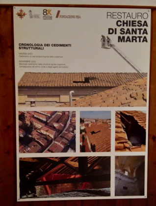 Il 3 Maggio 2022 , un tuono sordo di primo mattino : intorno alle 8 crolla il tetto della Chiesa di Santa Marta a causa di un improvviso cedimento delle travi provocato dalle infiltrazioni di acqua sulle volte e sulle strutture sottostanti. Nelle immagini seguenti i danni di quell’evento e gli interventi di restauro che si sono susseguiti nei due anni seguenti.