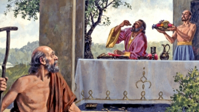 «C'era un uomo ricco, che indossava vestiti di porpora e di lino finissimo, e ogni giorno si dava a lauti banchetti. Un povero, di nome Lazzaro, stava alla sua porta, coperto di piaghe, bramoso di sfamarsi con quello che cadeva dalla tavola del ricco; ma erano i cani che venivano a leccare le sue piaghe.